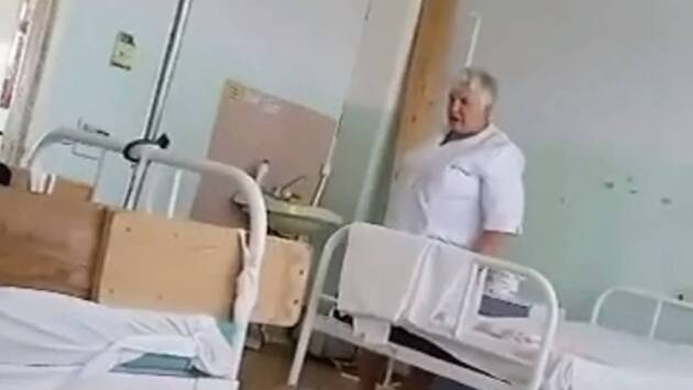На кадрах женщина в медицинском халате ругает сидящего на кровати мужчину, на ноге которого можно заметить наложенную шину. «Пошел вон», — говорит она и толкает мужчину, после чего он теряет равновесие и падает на пол. Сотрудница не пытается оказать ему помощь и уходит.
