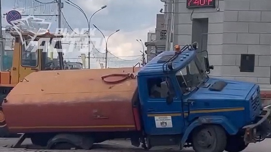 Днём в понедельник возле здания мэрии Новосибирска частично провалилась под землю поливальная машина. Информация об этом оявилась в паблике АСТ-54.