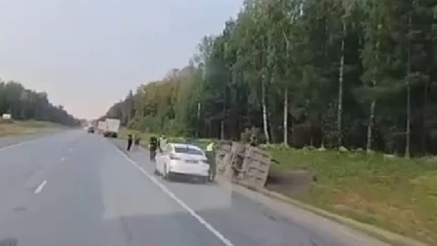 Также произошло еще одно ДТП, водитель большегруза, двигаясь на высокой скорости, столкнулся с останками животного, что привело к перевороту транспортного средства.