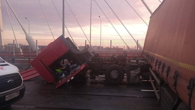 Ранним утром в Петербурге на Вантовом мосту по КАД произошло серьезное ДТП, в результате которого фура с прицепом столкнулась с ограждением, вызвав значительные помехи в движении.