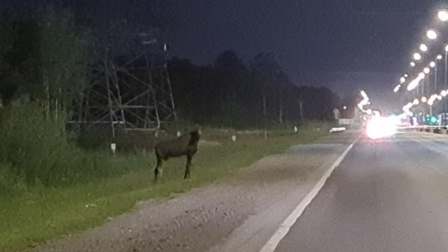 В Тюмени в районе ТЭЦ-2 накануне поздно вечером на дорогу вышел лось. Фотографиями животного поделился в социальной сети проезжавший мимо очевидец.