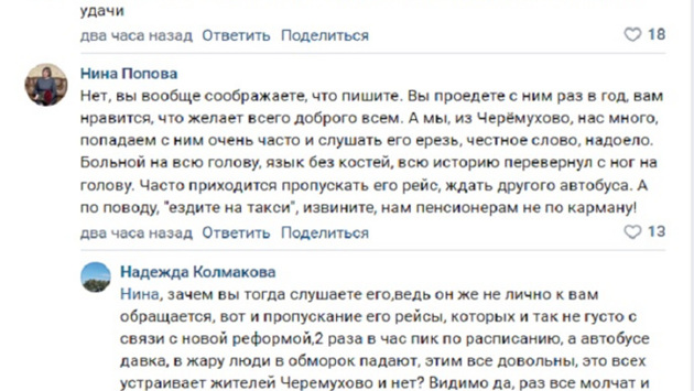 Мнения курганцев в комментариях разделились. Одни горожане высказали недовольство тем, что в поездке из микрорайона Черемухово в Курган устают от вольных трактовок водителем истории России. «Часто приходится пропускать его рейс, ждать другого автобуса, а на такси пенсионерам ездить не по карману», — написала в комментариях горожанка.