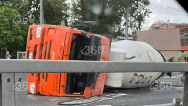 В Москве бетономешалка опрокинулась на бок и залила цементом дорогу