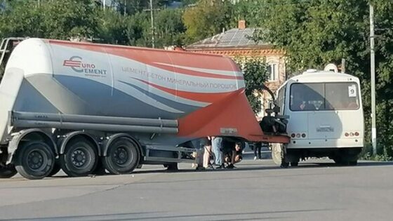 ДТП с участием пассажирского автобуса случилось 31 июля в Вольске Саратовской области. Как сообщает портал «Вольск.ру», цистерна большегруза с цементом, оторвавшись, врезалась в общественный транспорт. Столкновение произошло на автобусной остановке. К счастью, пассажиры не пострадали.