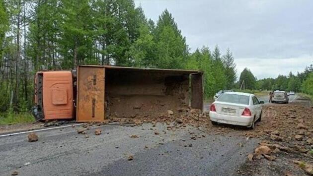 КАМАЗ с песком и камнями упал на трассе в Читинском районе возле озера Арахлей, содержимое кузова разлетелось по дороге. Об этом 6 августа сообщили в telegram – канале «Чита и Забайкалье. Ох, и Новости».