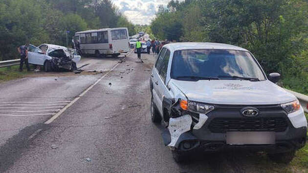 В Собинском районе Владимирской области произошло ДТП с участием рейсового автобуса и трех автомобилей, сообщает "МВД Медиа". Предварительно установлено, что рейсовый автобус двигался по дороге в сторону Собинки. В него врезался автомобиль Lada, водитель которого выехал на встречную полосу. После этого автобус протаранил автомобиль Chery, а Lada столкнулась с внедорожником "Нива". "Имеется информация о 10 пассажирах автобуса, обратившихся за медицинской помощью. Водитель легкового автомобиля "Лада" госпитализирован, а его пассажиру оказана амбулаторная медицинская помощь", - уточняется в сообщении МВД. На фото с последствиями ДТП видно, что у автомобиля Lada разбита передняя часть. "Нива" получила удар по касательной, у нее смято правое переднее крыло. Автобус ударился передней частью в металлический отбойник на встречной обочине.