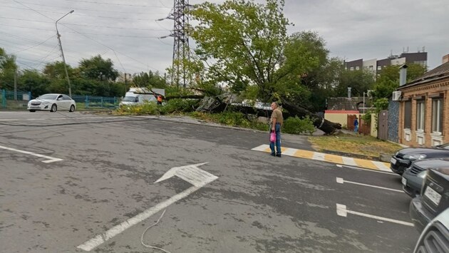 Ростовская область, 5 сентября 2023. DON24.RU. В Ростове на Нансена, 141, упавшее дерево повредило два автомобиля. Об этом сообщает местный паблик. «Упавшее дерево оборвало провода и повредило два автомобиля», – пишет источник. Очевидцы сообщают, что на месте работаю спасательные службы. В сети пишут, что еще одно дерево упало на ул. Филимоновской, 281. Фото: сообщество «Главный – Новости Ростова-на-Дону – 161» в сети «ВКонтакте»