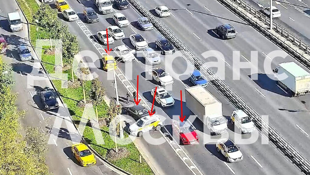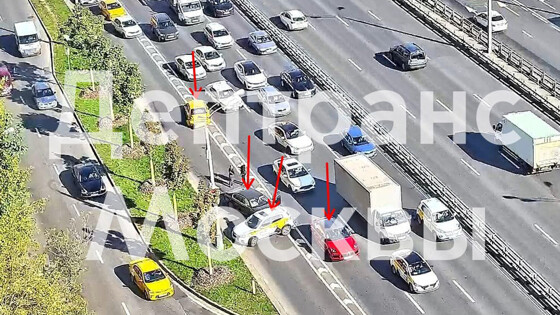 Судя по фото, в дорожно-транспортное происшествие попали две машины такси и две легковушки. Авария произошла в крайнем правом ряду. Одна из машин задела автомобиль, двигавшийся по соседней полосе. Все машины получили небольшие повреждения кузовов.