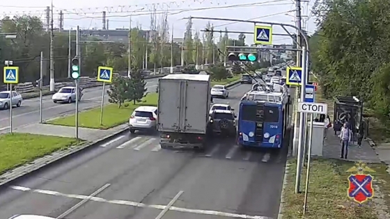 Как сообщили в пресс-службе ГУ МВД России по региону, дорожная авария произошла возле остановки общественного транспорта «Библиотечная» в 8.30. Водитель автомобиля попытался перестроиться на другую полосу движения, но столкнулся с грузовиком и троллейбусом. Момент ДТП попал на камеры видеонаблюдения.