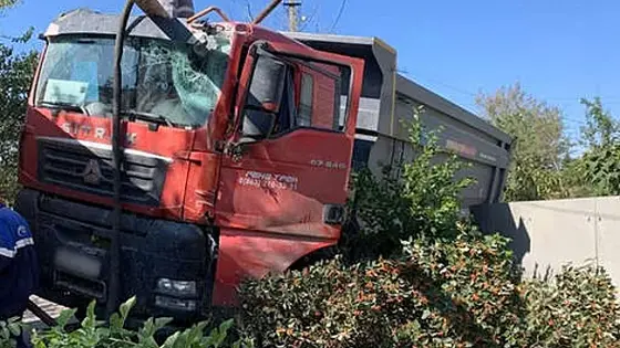 На кадрах с последствиями ДТП видно, что самосвал Sitrak после остановки накренился на левый борт.
