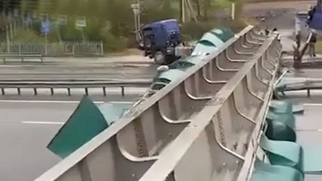 По словам очевидцев происшествия, водитель грузового автомобиля не опустил кузов во время пересечения этого участка, в результате сооружение было буквально снесено. Водителю требуется госпитализация.