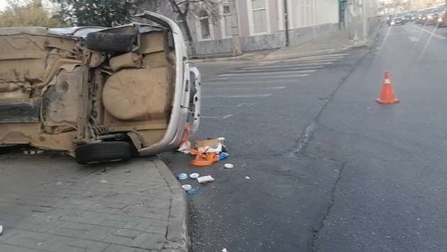 Иномарка перевернулась и отлетела на тротуар после столкновения с микроавтобусом в Нижнем Новгороде