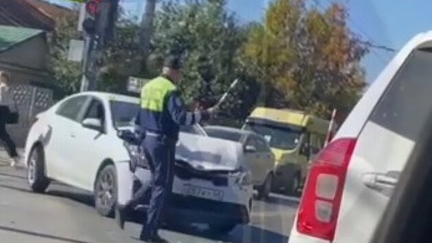 Также видно, что на место происшествия прибыли медики и сотрудники ГИБДД. Движение автомобилей затруднено, поэтому на перекрестке работает регулировщик.
