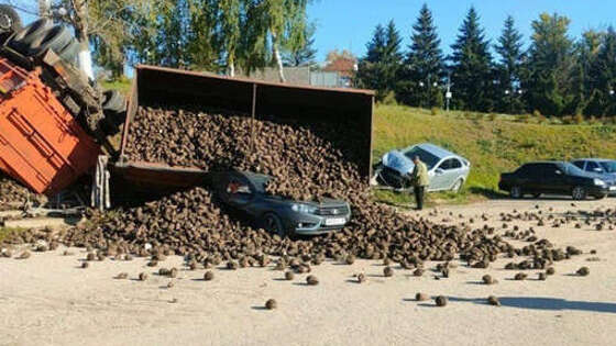 В Липецкой области грузовик со свеклой перевернулся на несколько легковых авто
