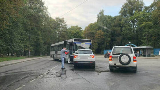 В Калининграде на перекрёстке Киевской и Камской легковушка нос в нос столкнулась с автобусом