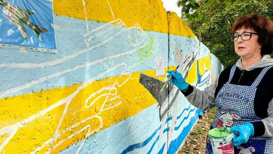 В Монине по вдоль улицы Дементьева украшают железобетонный забор. Местная жительница Евгения Швецова расписала уже 200 плит забора, сейчас она рисует авиацию.