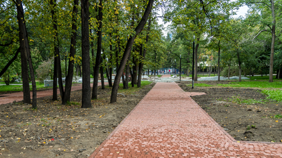 . Сейчас подрядчики заняты благоустройством дорожно-тропиночной сети. Дорожки в сквере теперь будут двух цветов: белой плиткой выложены основные транзиты, красной – вспомогательные.