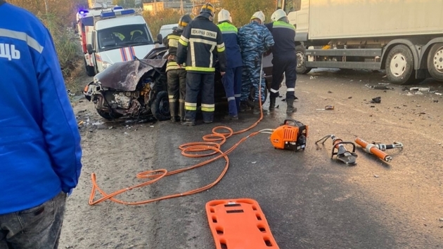 По предварительным данным, грузовик столкнулся с легковым автомобилем ВАЗ. При этом водителю и пассажиру легковушки помогли покинуть поврежденный транспорт сотрудники МЧС при помощи специального оборудования.