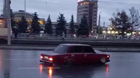 На кадрах, опубликованных Telegram-каналом «Челябинск с огоньком», видно, что водитель пытается тронуться с места на мокром асфальте. Автомобиль буксует, но уехать ему не удается. Колеса Lada за счет занижения подвески скрыты в арках. У передних колес сильно изменен развал.