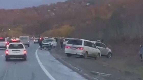 Один из автомобилей опрокинулся на бок, еще на нескольких видны следы столкновения. Очевидцы сообщают, что на трассе образовалась большая пробка. О пострадавших не сообщается. Еще три автомобиля свалились в кювет на трассе Елизово — Паратунка.