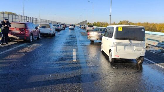 Предварительно установлено, что женщина, управляя автомобилем Daihatsu, около 06.45 часов на скользком покрытии автодороги, на мостовом переходе, не справилась с управлением и наехала на отбойник, после чего произошли последующие столкновения.