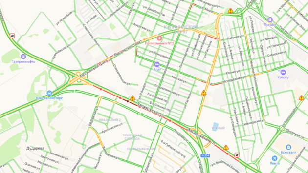 «Тюмень, пробки три балла из десяти. Улица Федюнинского — ДТП в среднем ряду», — указано на сайте. Улица Закалужская отмечена красным цветом, что говорит о наличии дорожного затора на дороге.