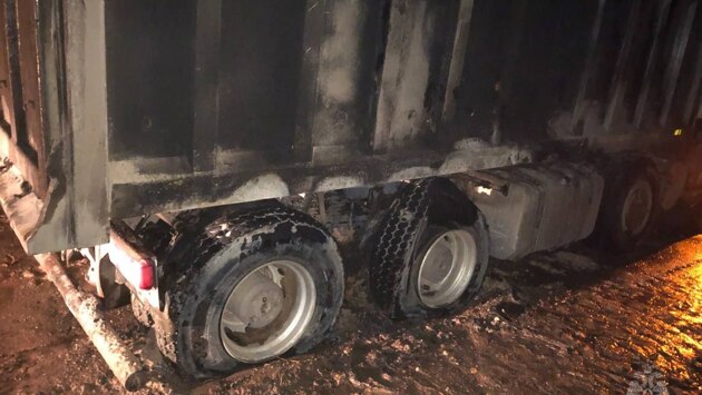 Предварительной причиной возгорания называют неисправность систем, механизмов, узлов — у автомобиля лопнула покрышка. В результате огонь уничтожил 4 задних правых колеса грузовика.
