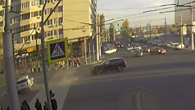 На кадрах заметно, что водитель белой иномарки пытался преодолеть перекресток на красный свет и врезался в черную автомашину. При этом пешеходы, которые готовились переходить улицу на разрешающий сигнал светофора, лишь чудом не пострадали. .