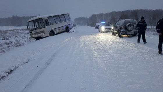 «Нива» врезалась в автобус на снежной трассе под Новосибирском