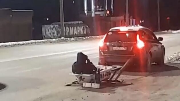 На повороте один из молодых людей, который был одет в костюм, вывалился из этой импровизированной «люльки».