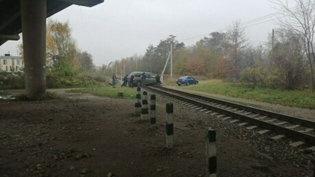 В Калининграде легковушка заглохла на ж/д путях, её толкают несколько мужчин (фото)
