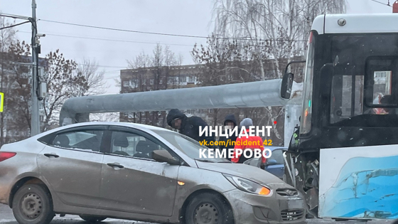 В кузбасской столице не поделили оживленный перекресток легковушка и автобус, что привело к сильным повреждениям.