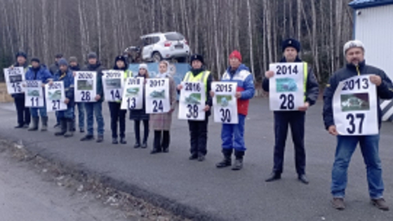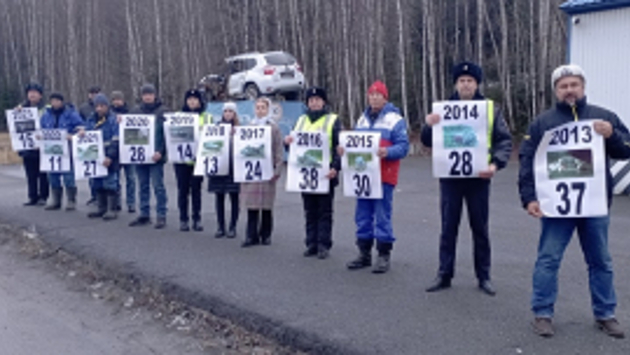Участники мероприятия выстроились в живую инсталляцию вдоль федеральной трассы, держа в руках таблички с числом погибших в ДТП