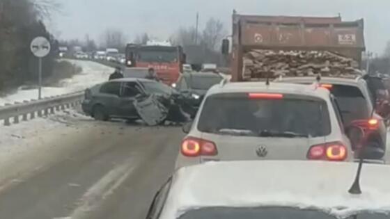 Машина получила сильные механические повреждения. На месте аварии образовалась большая пробка, так как легковушка встала поперёк дороги. На месте работают экстренные службы.