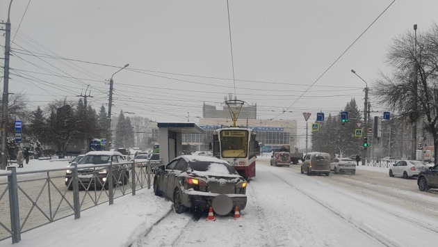 Водитель Mazda 3 в Новосибирске заехал на трамвайные пути и сбил мужчину, державшего на руках ребенка, который стоял на остановке.