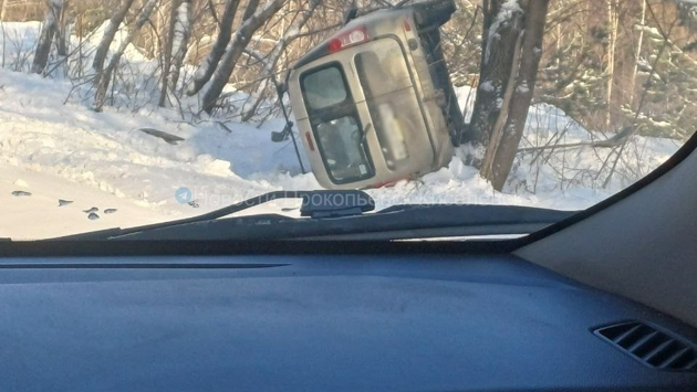 Около Прокопьевска серый автомобиль слетел с дороги и завалился на бок. Очевидец снял последствия аварии на камеру.