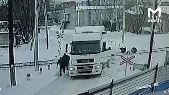На кадрах видно стоящий поперек путей «КамАЗ», из водительской двери «КамАЗа» выпрыгивает мужчина с ребенком в руках. Через мгновение в большегруз врезается состав.