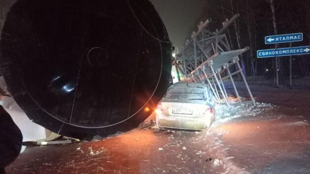 Ижевск. Удмуртия. На дороге «Ижевск-Воткинск» с тягача «Ситрак» упала цистерна на автомобиль «Фольксваген Поло». Об этом сообщает 1 отдел УГИБДД МВД по Удмуртии.