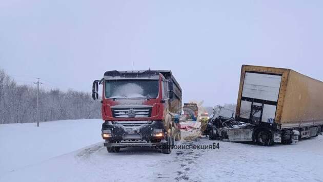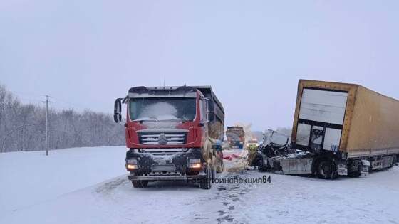 У фуры оторвало кабину при столкновении с грузовиком у саратовского села Михайловка. Водителя деблокировали спасатели