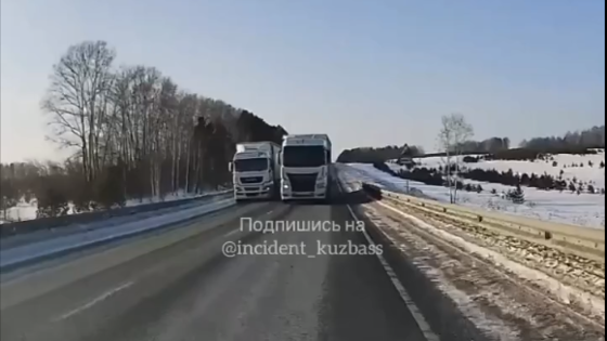 В Кузбассе еще один водитель поделился записью с камеры видеорегистратора своей машины, на которой видно, что он чудом спасся от двух фур.