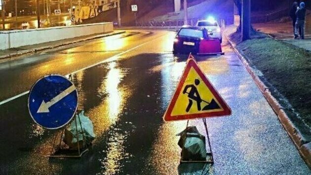 По словам водителей, нельзя ни подняться на эстакаду, ни спуститься с неё. Сейчас на месте проводят ремонтные работы.