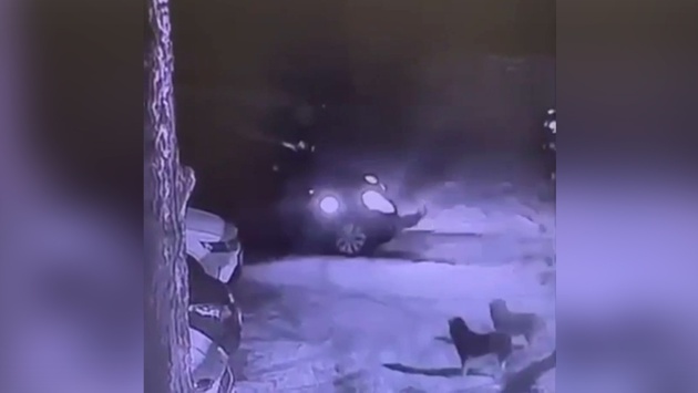Момент аварии попал на камеры наблюдения. На видео машина медленно катится по парковке с мигающими фарами, а собаки разбегаются в разные стороны.