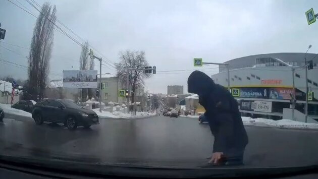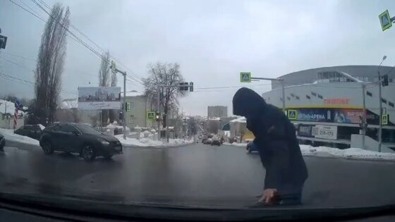 Справа наперерез движению выбегает молодой человек в накинутом на голову капюшоне и едва не попадает под колеса. Парень спотыкается, подскакивает и касается рукой капота автомобиля, а затем продолжает быстрым шагом переходить дорогу.