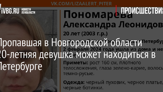 Александра Пономарева пропала более двух недель назад. С тех пор о судьбе девушки ничего неизвестно. В Петербурге ведутся поиски Александры Пономаревой, бесследно пропавшей в Великом Новгороде. 20-летняя девушка ушла из дома 2 февраля и не вернулась. На связь с родными и друзьями пропавшая не выходит. Если вы обладаете какой-либо информацией о местонахождении Александры, просьба срочно сообщать по контактам, указанным ниже, или в полицию.