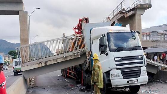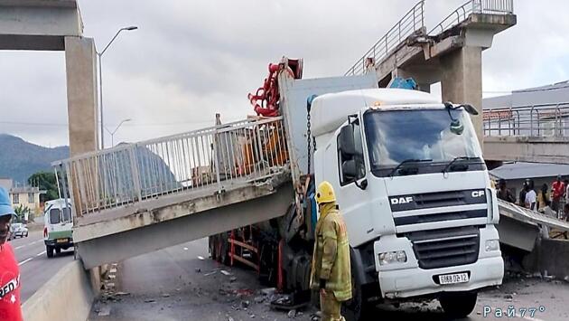 Грузовик, перевозивший массивную стройтехнику, не прошёл по габаритам и снёс пешеходный мост в городе Рош Буа (Порт-Луи, остров Маврикий).