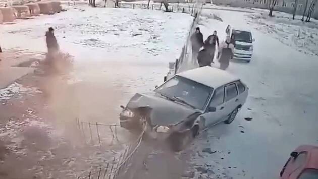 На кадрах видно, как ехавший по заснеженной дороге автомобиль сворачивает на обочину и врезается в группу учеников, двоих подростков ударом отбрасывает в сторону.