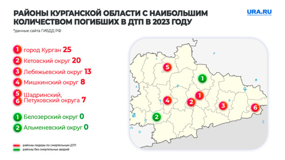 В 2022 году в Кургане так же погибли 25 человек в авариях. Аналогичное количество ДТП случилось годом ранее на дорогах Мишкинского округа. Кетовский округ поднялся на одну позицию вверх — в 2022 году здесь случилось в два раза меньше аварий со смертельным исходом (10). Также в лидерах 2022 года были Шумихинский и Щучанский округа. Спустя год количество смертельных ДТП в них резко сократилось (на 75%).