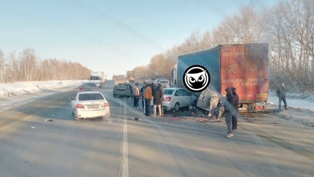 По фото, размещенным очевидцем, можно понять, что легковушка въехала в левый бок грузовика. Еще одна поврежденная машина находится на середине проезжей части.