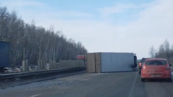 Авария произошла в пятницу, 8 марта. Судя по кадрам, автомобиль задел разделительное ограждение. Большегруз лежит на боку, перегородив две полосы для движения.