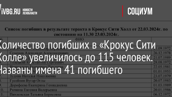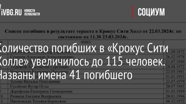 Количество погибших в «Крокус Сити Холле» увеличилось до 115 человек. Названы имена 41 погибшего